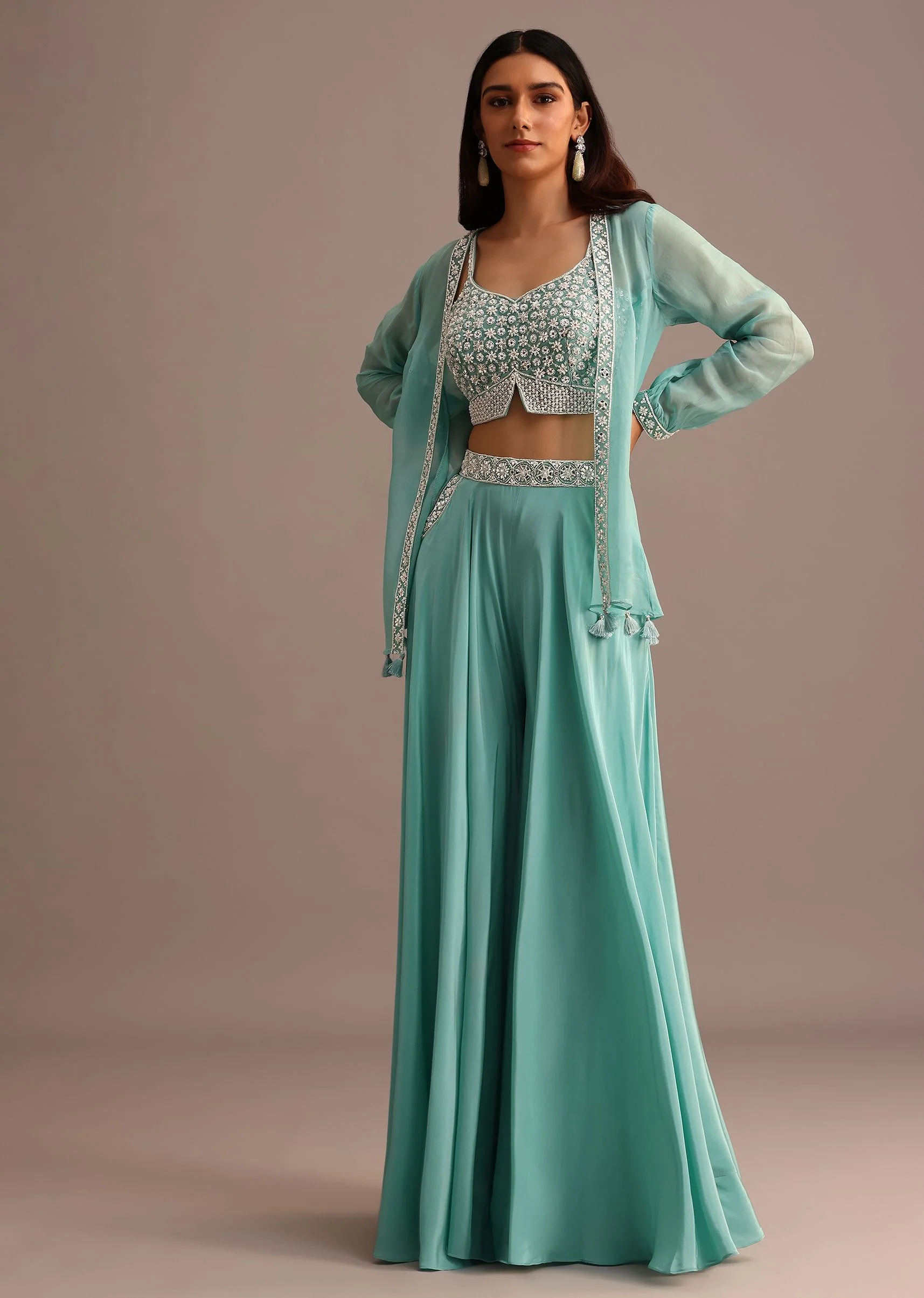 Blue Embellished Croptop Palazzo Set With Organza Jacket