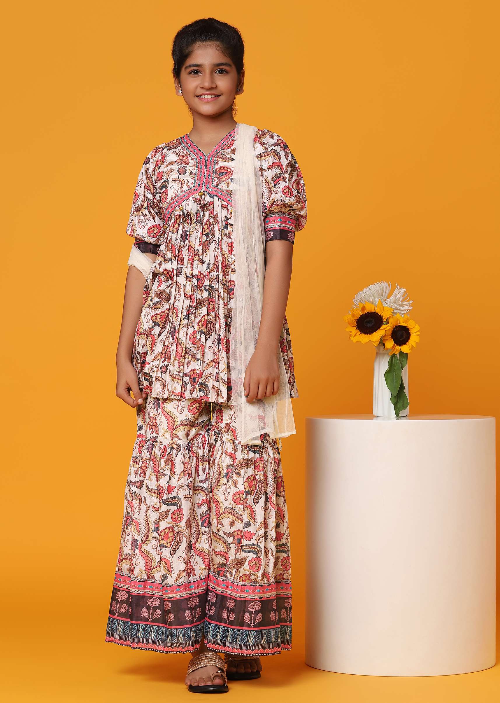 - Add a touch of elegance to your little girl's wardrobe with the cream-white printed kurti and palazzo set.