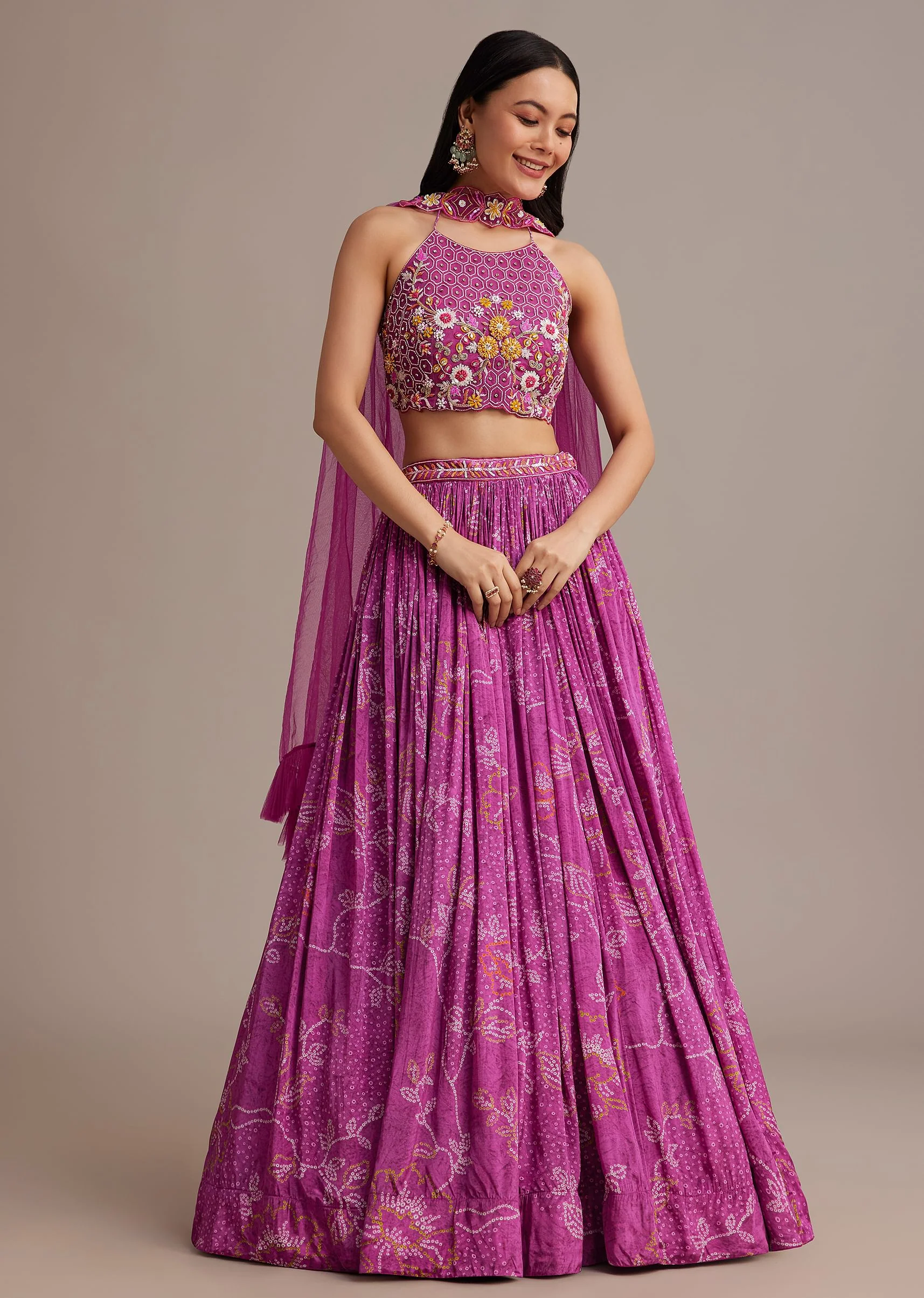 - Paired with a vibrant bandhani printed lehenga this ensemble is a burst of color and texture.