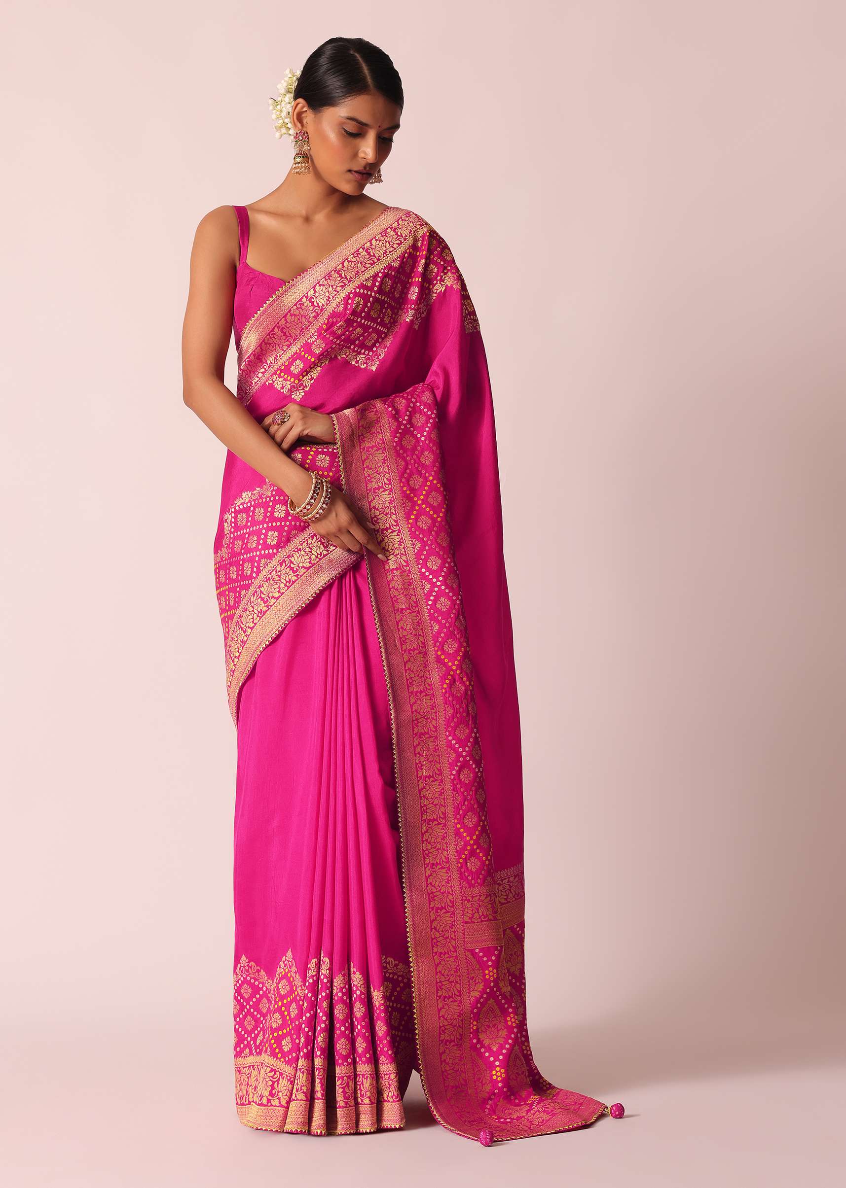 - Expertly crafted on a vibrant rani pink hue, it showcases breathtaking Bandhani detailing and woven motifs.