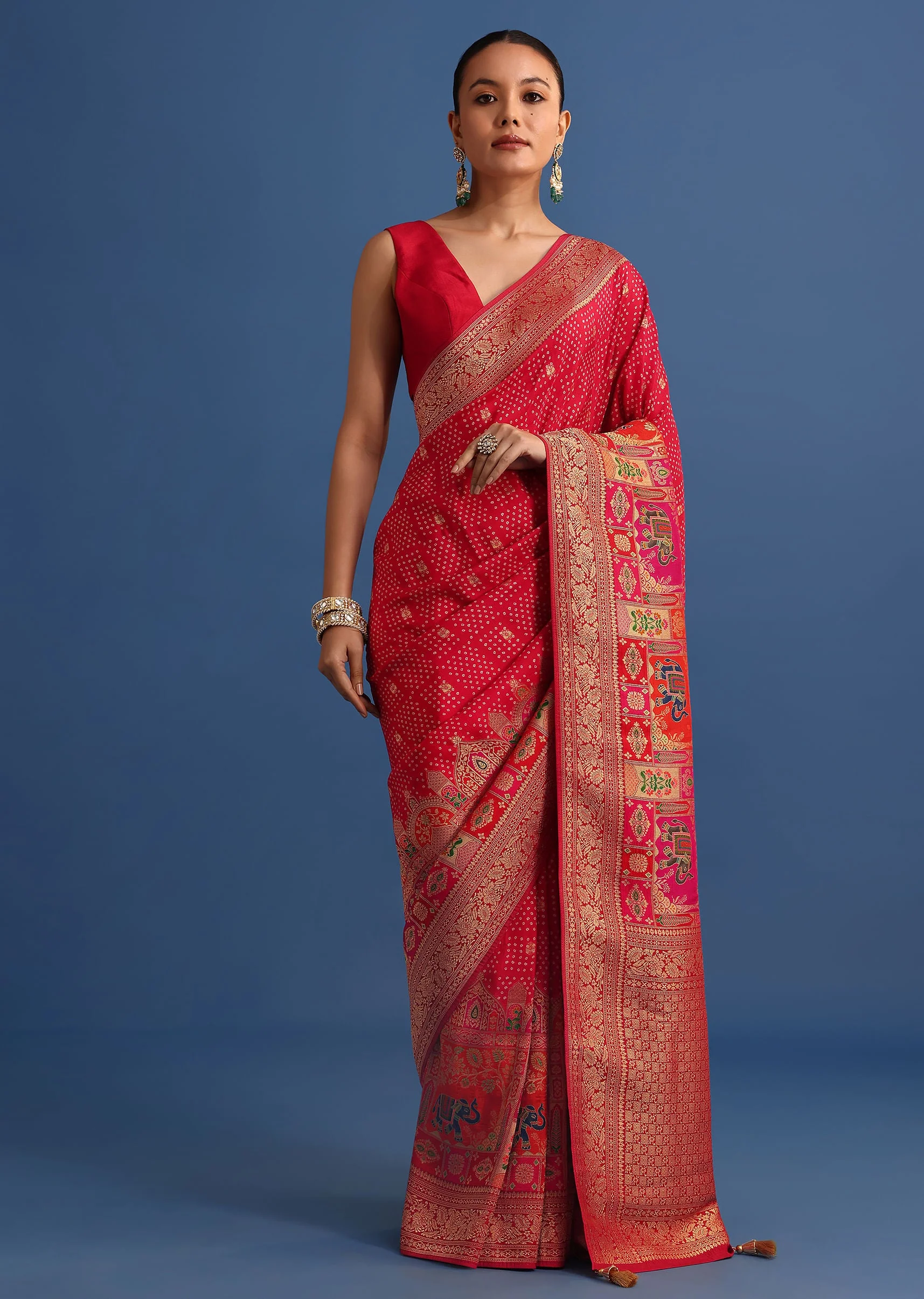 Red Banarasi Bandhani Satin Saree With Traditional Brocade Motifs On Border